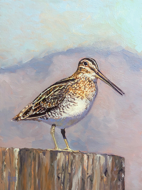 Oil on hardboard, 6" x 8". This normally secretive and ground dwelling Wilson's Snipe ventures to the top of a fence post near Malheur National Wildlife Refuge to sing and court a mate. The snipe's plumage provides excellent camoflauge on the ground in his marshy habitat. Available, contact the artist.